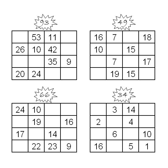Pred teboj je čarobni kvadrat. Prazna polja izpolni tako, da bo vsota posamezne vrstice in posameznega stolpca enaka številu, ki je napisano nad kvadratom.