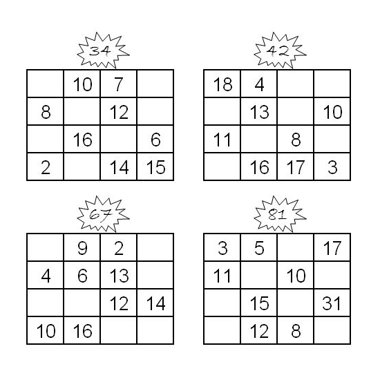 Pred teboj je čarobni kvadrat. Prazna polja izpolni tako, da bo vsota posamezne vrstice in posameznega stolpca enaka številu, ki je napisano nad kvadratom.