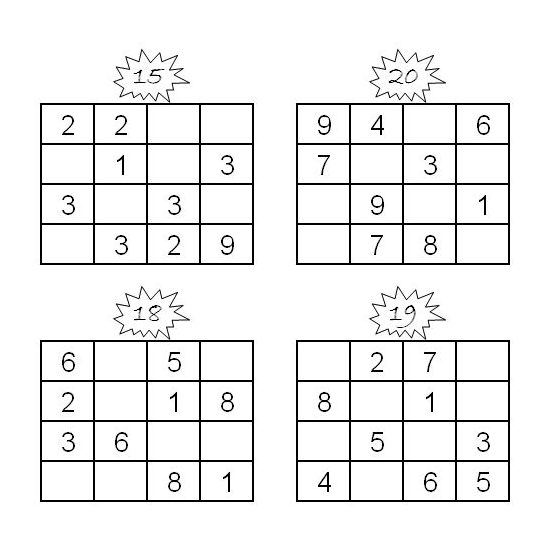 Pred teboj je čarobni kvadrat. Prazna polja izpolni tako, da bo vsota posamezne vrstice in posameznega stolpca enaka številu, ki je napisano nad kvadratom.