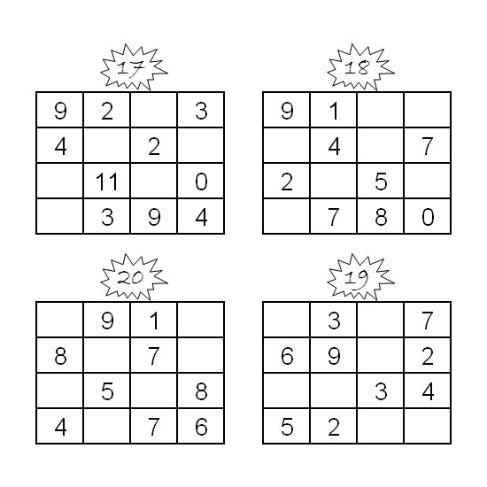 Pred teboj je čarobni kvadrat. Prazna polja izpolni tako, da bo vsota posamezne vrstice in posameznega stolpca enaka številu, ki je napisano nad kvadratom.