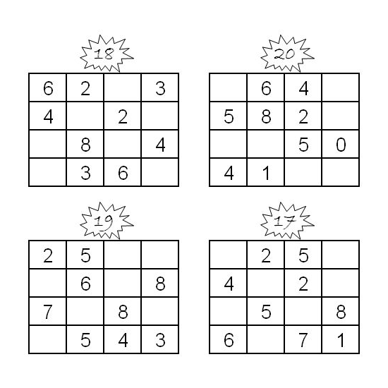 Pred teboj je čarobni kvadrat. Prazna polja izpolni tako, da bo vsota posamezne vrstice in posameznega stolpca enaka številu, ki je napisano nad kvadratom.