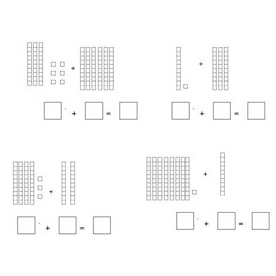 Pod vsak prikaz zapiši račun. En stolpec iz 10 kvadratkov pomeni desetico, en kvadratek pa pomeni enico.
