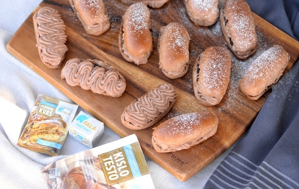Moki primešamo kakav v prahu. Kvas Fala raztopimo v mleku in ga prilijemo k moki. Mešanici moke s kvasom dodamo ostale sestavine brez maščobe. Zamesimo kvašeno testo; najprej mešamo počasi in med mešanjem postopno dodajamo zmehčano maslo. Na koncu mešamo deset minut na najvišji hitrosti, da postane testo gladko. Zatem posodo pokrijemo s folijo in pustimo testo na toplem vzhajati.
