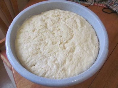 po eni uri testo stresemo v drugo posodo, ki jo predhodno posipamo z moko. pustimo počivati pol ure.